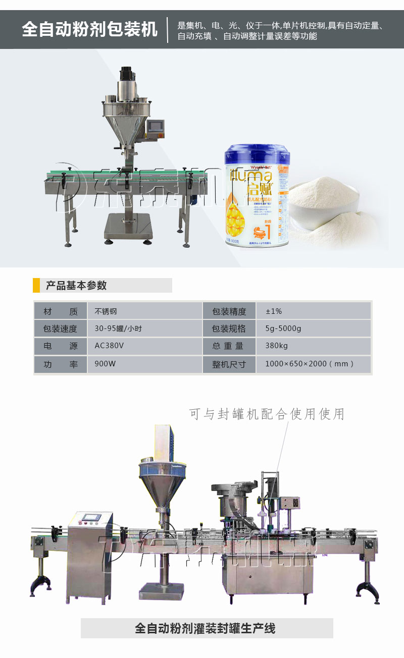 ①全自動(dòng)奶粉灌裝機(jī) 外表除電機(jī)外其余均為不銹鋼制成;組合式透明料箱,無需工具即可方便拆洗。