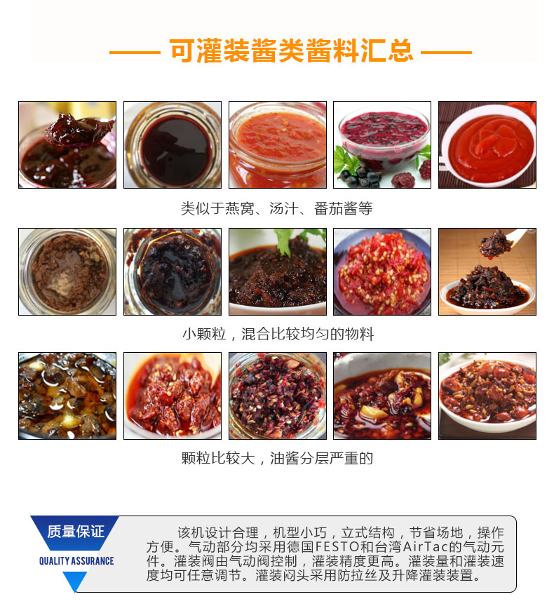 隨著機(jī)械技術(shù)的快速發(fā)展灌裝機(jī)的發(fā)展也是日新月異,使得其種類比較多。蘸醬在我國擁有悠久的歷史,在我國烹飪中占有著重要的地位,發(fā)展到現(xiàn)在在做菜和食品中也不可或缺,巨大的市場使得蘸醬灌裝機(jī)擁有巨